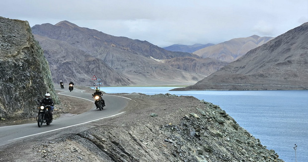 Η τρελή κοσμοσυρροή που συναντάμε εκεί μάς ωθεί να ξανακαβαλήσουμε γρήγορα τις μοτοσυκλέτες μας και να συνεχίσουμε με κατεύθυνση τη λίμνη Pangong. Ο δρόμος στενεύει σε μία λωρίδα, η κίνηση αυξάνεται αισθητά και είναι η πρώτη φορά στο ταξίδι μας που συναντάμε τόσες πολλές μοτοσυκλέτες.